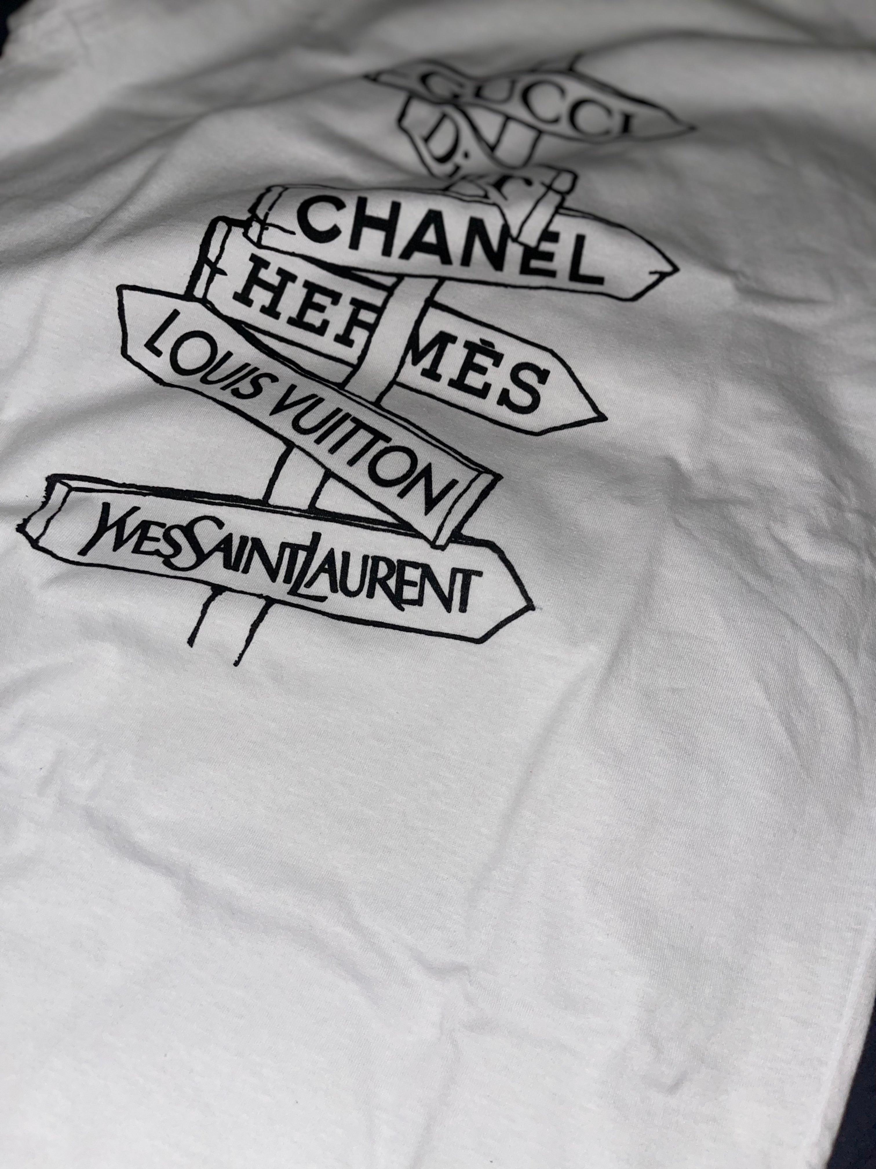 The Designer Mix graphic tee features six of your favorite luxury brand names. This tee fits true-to-size with a fair amount of stretch for a relaxed fit. Wear with your favorite jegging, mom jean, biker or denim shorts. Or you can style it with a fun flirty pleated or faux-leather skirt. Then, top it off with designer a shoe or sneaker, and bag from one of the six designer brands and it's a snooty look.
